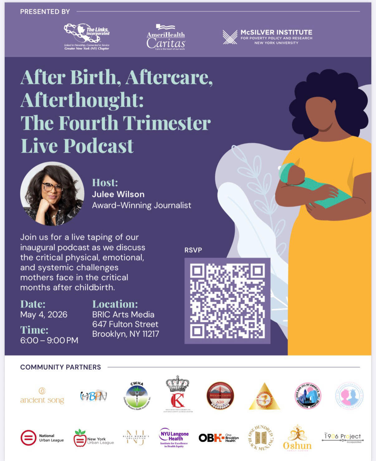 We are bringing together a distinguished group of speakers from around the country– maternal health experts, advocates, individuals with lived experience and policy makers to identify solutions and strategies for better support systems during this vulnerable stage. We are delighted that our host will be award-winning Journalist Julee Wilson.